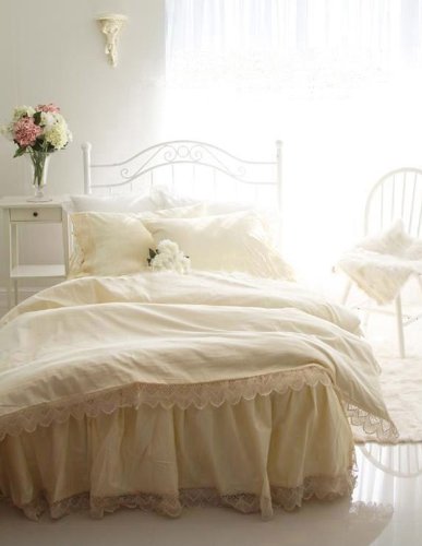 This Chic Yellow Elegant lace Duvet cover Bedding Set includes one bed skirt, one duvet cover (not duver or comforter)and matching standard pillow shams (one sham for twin set, two shams for queen and king set)..The set is very elegant and delicate with a little bit of romantic feeling. Light yellow high quantity cotton made. With elegant wide lace around the edge and and ties decorated on one side of shams. Fabric: 100% Cotton Size: 4pc Queen set:59"x79"(bed skirt) 79"x87"(duvet cover) 20"x30"(shams). Machine Washable weight:4kg. Read more...