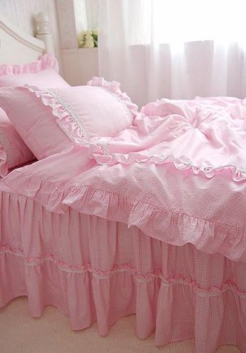Shabby and Elegant Pink gingham Cotton 4pc Bedding duvet cover set New arrival of this year I-1-2011-06 This chic set includes one bed skirt, one duvet cover and two matching standard pillow shams.The set is very elegant and delicate with a little bit of romantic feeling. With pink gingham.High quality cotton made. White lace deocrated. Fabric: 100% Cotton Size: Twin:47"x79"(bed skirt) 63"x83""(duvet cover) 20"x30"(sham) Queen:59"x79"(bed skirt) 79"x87""(duvet cover) 20"x30"(sham) King:71"x79"(bed skirt) 87"x95"(duvet cover) 20"x30"(sham) Machine Washable weight:4kg. The bedding can be personaliezed in your own size, but the handing time will be 10 business days. Please give me the detail of measurement.Personalized items can not be returned, Read more...